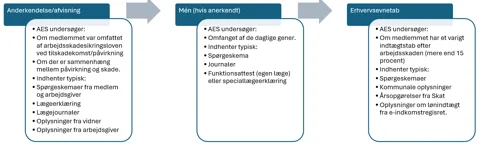 Hvis skaden kan anerkendes, vil Arbejdsmarkedets Erhvervssikring (AES) efterfølgende tage stilling til, om der er godtgørelse for varigt mén – og endelig om det er aktuelt med erstatning for tab af erhvervsevne.