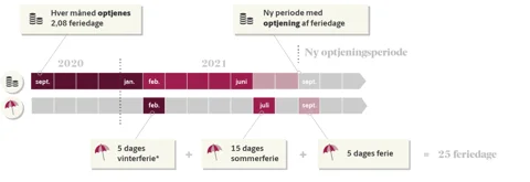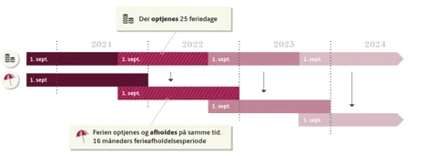 Samtidighedsferie optjenes i ferieåret, der går fra 1. september til 31. august, men kan afholdes i ferieafholdelsesåret, der går fra 1. september til 31. december i det følgende år. Du optjener 2,08 feriedage pr. måned, uanset om du er deltids- eller fuldtidsansat.