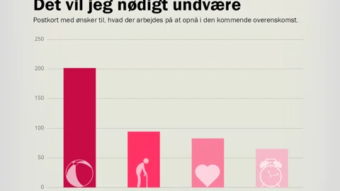 Fokus på ligeløn og bedre muligheder for efteruddannelse fylder med hhv. 89 og 82 ’ønsker’ også godt på listen, mens kun otte i den anden ende af skalaen ønsker fritvalgsordninger prioriteret højt.