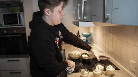 På et andet plejehjem i Herlev, Lærkegaard Center, er beboerne nået til desserten. Hjemmelavet citronfromage anrettet i små fine glas. Men først skal spisebordet ryddes, og der skal stilles i opvaskemaskinen - og den tjans har 15-årige Lukas Bach Hansen.