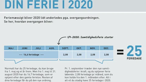 I sommeren 2020 kan langt de fleste også holde sommerferie, som de plejer. For når vi når dertil, vil du have optjent 16,7 feriedage. Så hvis du holder tre ugers sommerferie, er der feriedage nok - for tre uger svarer til 15 feriedage.