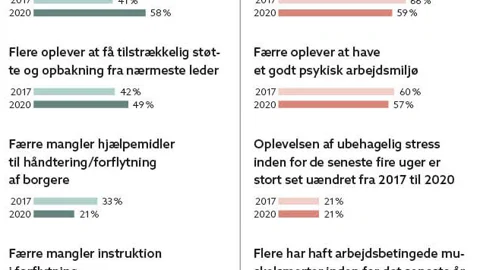 Men undersøgelsen viser også, at er der stadig er områder, hvor det halter gevaldigt med socialpædagogers arbejdsmiljø. Alt for mange bliver udsat for vold og trusler eller døjer med smerter som følge af et hårdt fysisk arbejde. Og næsten hver anden svarer i undersøgelsen, at de ikke har mulighed for restitution i løbet af en arbejdsdag.