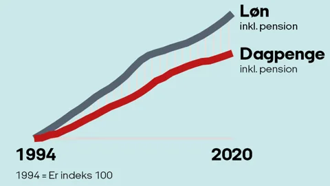 Hvis en gennemsnitlig lønmodtager mistede jobbet i midten af 1990’erne, modtog vedkommende en dagpengesats, der dækkede 57 pct. af personens tidligere løn. Mister man jobbet i dag modtager, man kun 47 pct. Det svarer til et kontant tab på over 4000 kroner om måneden.