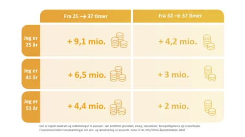 Grafikken viser en gennemsnitsberegning. Hvad færre timer betyder i kroner og øre for den enkelte, kan man komme nærmere ved at bruge denne beregner: