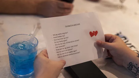 Ved bordene sidder gæsterne klar til middag. Nogle har placeret sig sammen med dem, de kender, og andre hilser pænt på de bordherrer og -damer, de ikke kender endnu. Et par af gæsterne beror sig på samtalekort udarbejdet af seksualvejlederne for at få samtalen i gang. De ligger til fri afhentning i baren.