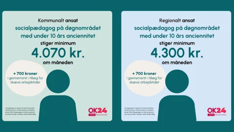 Oven i lønstigningerne fra OK24 kommer det historiske lønløft til socialpædagoger i trepartsaftalen, som kommunalt og regionalt ansatte socialpædagoger på døgnoverenskomsten er omfattet af, på ca. 1800 kr. om måneden i generelt lønløft. Som en del af trepartsaftalen blev der også afsat 700 kr. om måneden for arbejde på skæve tidspunkter. De penge kommer dig til gode, hvis du arbejder om aftenen, natten eller i weekenden, ved at særydelserne for arbejde på skæve tider er blevet forhøjet.