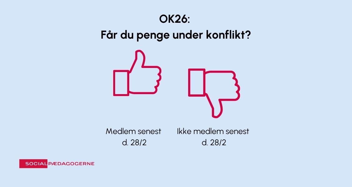Du skal have været medlem af Socialpædagogerne i mindst en måned for at være berettiget til konfliktunderstøttelse. Er du ikke allerede medlem, betyder det, at du skal melde dig ind i Socialpædagogerne senest d. 28. februar 2026, hvis du vil være sikker på at kunne få konfliktunderstøttelse under en eventuel konflikt i forbindelse med OK26.