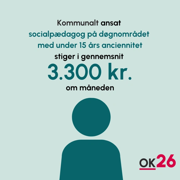 En kommunalt ansat socialpædagog på døgnområdet med under 15 års anciennitet stiger i gennemsnit 3.300 kr. om måneden, hvis der bliver stemt ja til OK26. Og socialpædagoger i særlige stillinger stiger i gennemsnit 3.500 kr. om måneden med OK26.