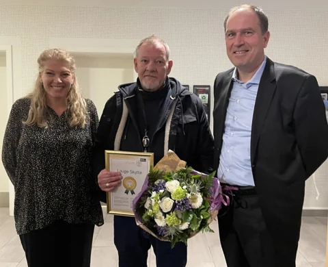Billedtekst: Vinder af ‘Årets kollega’-prisen Lauge Skytte sammen med borgmester Birgitte Neergaard-Kofod og kommunaldirektør Jonatan Schloss. Foto: Egedal Kommune