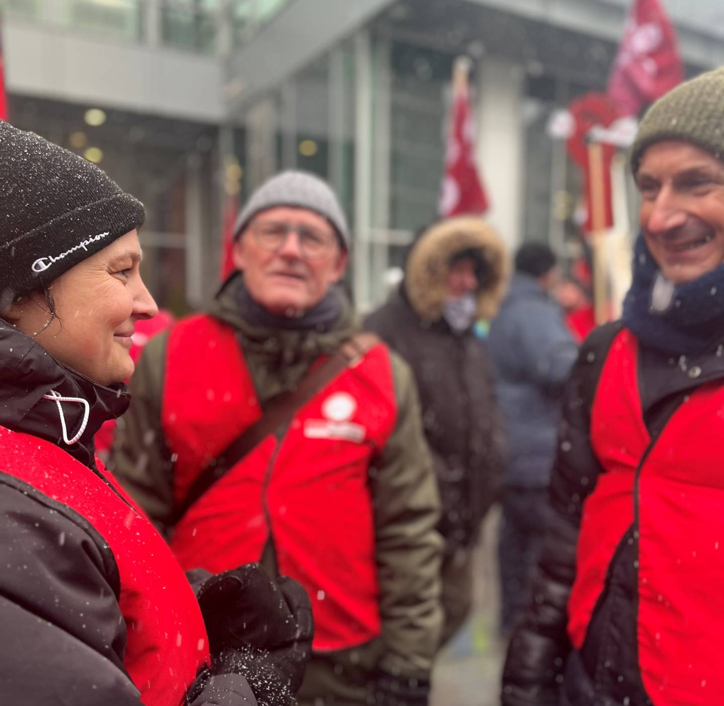 Kreds Storkøbenhavns formand Lars Petersen og næstformænd Rita Slangerup og Michel Kikkenborg trodser frostvejret for at demonstrere for medlemmernes interesser foran KL i 2024.