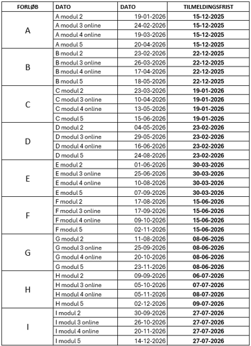 Vær opmærksom på, at tilmeldingsfristen til hvert hold ligger ca. 2 måneder før kursusstart på kursusmodul 1. Optagelse sker efter først-til-mølle princippet. Husk at tjekke, at du kan deltage i alle moduler, når du tilmelder dig TR-uddannelsen. (Kan du ikke deltage på et af modulerne bedes du vælge et andet forløb)